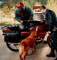 I looked over to see a dog with his nose in Dave's fairing deftly