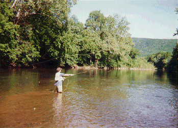 in depth, flow and bottom characteristics. The south fork usually runs about thirty to sixty yards across and about five feet at its deepest during normal periods of summer rainfall. The north fork runs just a bit narrower and shallower. The bottoms of both are a patchy mix of pebbles, mud and course sand with river grass and long ledges that often run at an angle to the flow of the rivers. The actual flow of the rivers is quite mild and I've never had a problem moving up or down stream. The temperature of both forks is usually warm enough to comfortably fish all day. You will quickly find that watching a large smallmouth hit a cork popper carefully dropped next to a stump in the shade of an overhanging tree is quite a thrill. I've had people tell me over and over that I will not have any luck with poppers for this or that reason, and I have yet to listen or to come away skunked. I find that fishing the shore from the middle of the river, and below the ledges is always productive. When the action on the poppers slows I often switch leaders and try sculpin or crayfish imitations, and concentrate directly below ledges and at the edges of weed beds. Make sure you have strike indicators, I prefer the Scientific Anglers. I have listed below some of my favorite (and most productive) spots on the north and south forks. I am listing the spots according to the nearest town to make navigating by map easier. Make sure to check weather conditions before setting out. Oak Hill, Virginia, the south fork. About 20 minutes south of Front Royal off of Route 340. Turn right onto State Road 661 and follow about a mile and a half to the dead-end at the river. There is ample space to park but make sure you pull off the road about thirty yards from the river so as not to get blocked in. Try moving up the river from the walk-in point. As you move up river fish the ledges to the left and the weed beds to the right.